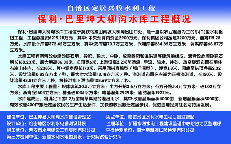 大柳溝水庫(kù)位于新疆維吾爾自治區(qū)巴里坤縣莫?dú)J烏拉山南坡,距哈密市154km。地理位置東經(jīng)93°35.5'-38',北緯43°35'-37'。水庫(kù)距巴里坤縣54.0km,有鄉(xiāng)村公路相通,交通比較便利。工程屬攔河式水庫(kù)。承擔(dān)下游灌溉、人畜用水的任務(wù),同時(shí)兼防洪功能,水庫(kù)控制灌溉面積1.2萬(wàn)畝。水庫(kù)總庫(kù)容372.42萬(wàn)m3,最大壩高36.33m,壩頂長(zhǎng)168.23m。樞紐工程由攔河壩,導(dǎo)流放水洞,溢洪道等建筑物組成。工程規(guī)模屬?。?)型。