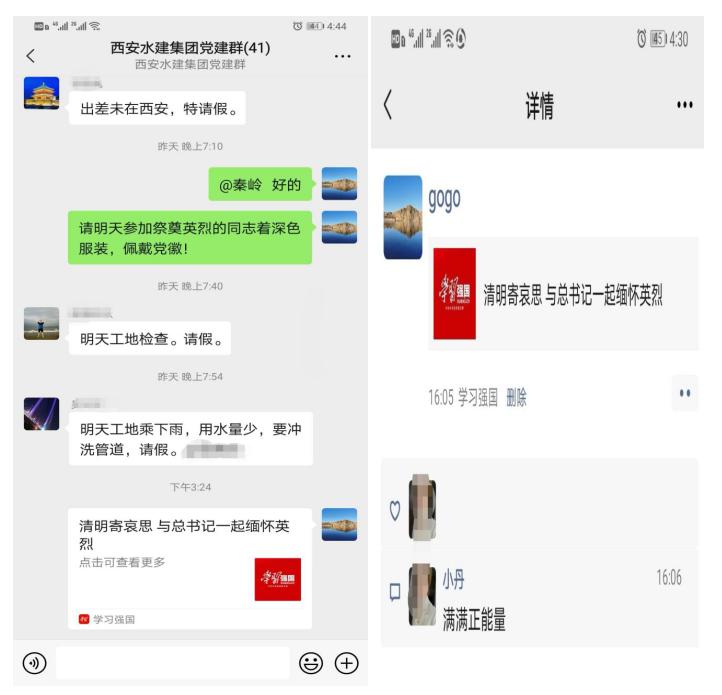 縷縷春風(fēng),綿綿細(xì)雨,說(shuō)不及對(duì)革命烈士的無(wú)限深情,道不盡對(duì)烈士英魂的無(wú)盡哀思。在黨支部書(shū)記的宣傳呼吁下,公司職工紛紛參與了學(xué)習(xí)強(qiáng)國(guó)平臺(tái)關(guān)于清明寄哀思 與總書(shū)記一起緬懷英烈微信轉(zhuǎn)發(fā)活動(dòng),并在黨建學(xué)習(xí)群進(jìn)行了宣傳轉(zhuǎn)發(fā),自覺(jué)放平手機(jī),為英烈默哀一分鐘。